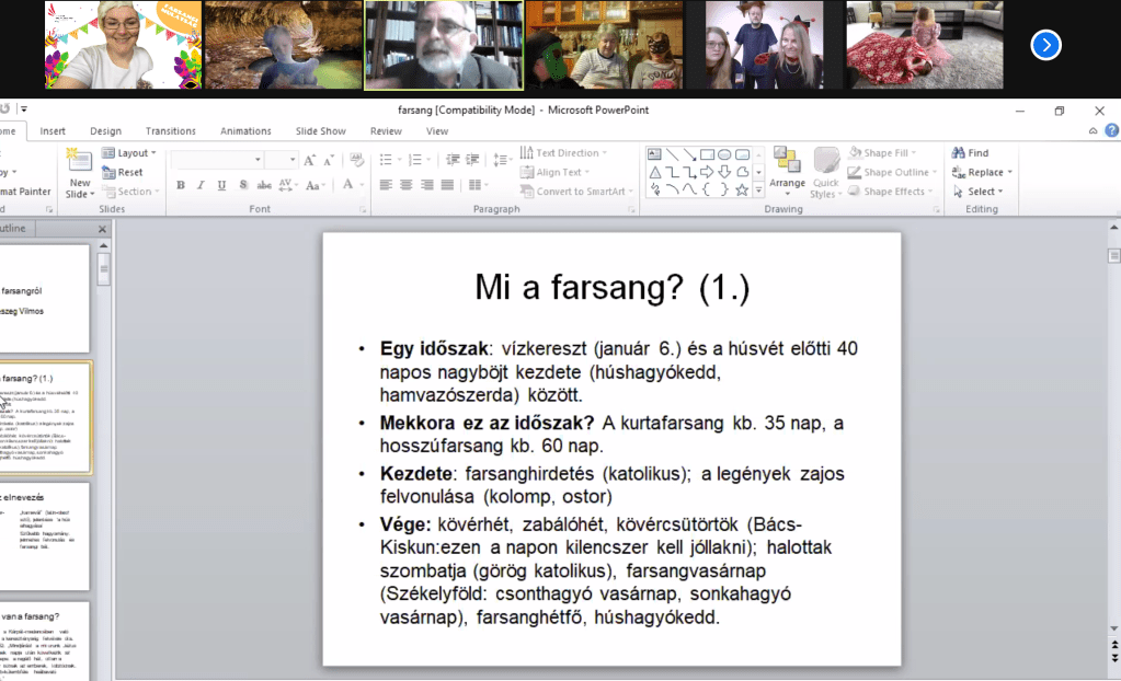 Fánkevő verseny, mesemondás, csujogatás mind befért a műsorba, de a találkozónk fénypontja a kolozsvári vendégünk volt. A farsang virtuális mivoltának köszönhetően vendégül láthattuk Dr. Keszeg Vilmost, a kolozsvári Babeș-Bolyai Tudományegyetem professzorát, akitől rengeteget tudtunk meg a farsangról, eredetéről és változatairól.